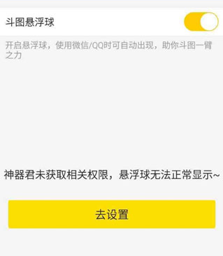 1、打开 APP 后,第一步可设置斗图悬浮球。开启悬浮球,在使用微信或 QQ 时它会自动出现,助力你畅快斗图。要是手机当前未授予此权限,可先前往设置进行相关操作。