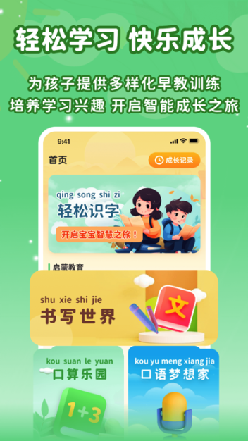 一款专为宝宝早教设计的APP,丰富多样的学习内容,包括识字、写字、成语、诗词读写、 加减乘除口算运算、英语书写和口语练习等多方面。宝宝可以在玩耍的同时学习基础的识字能力,提高口语表达能力,培养对算术的兴趣。结合了有趣的游戏和互动学习,旨在帮助宝宝轻松、愉快地学习。