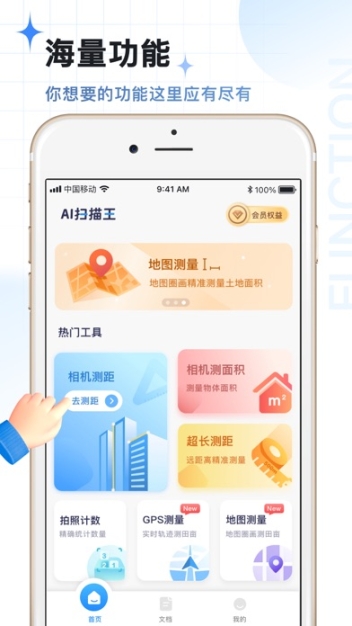 AI扫描王支持图片高清扫描、扫描转表格、扫描翻译识别、文字提取、证件文件扫描、拍照计数、扫描测量、智能写作等。