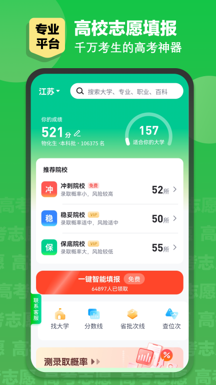 高考志愿填报工具依托全量招生录取数据、大学和专业特征数据,利用智能算法和机器学习精准定位院校和专业,规避掉档风险,发挥分数更大价值!