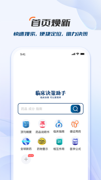临床决策助手APP包含药品说明书、循证用药、药物警示、全球新药、药品相互作用等临床用药信息,同时覆盖医院各科室临床指南内容、医学公式、医学期刊文献、精选诊疗内容等。