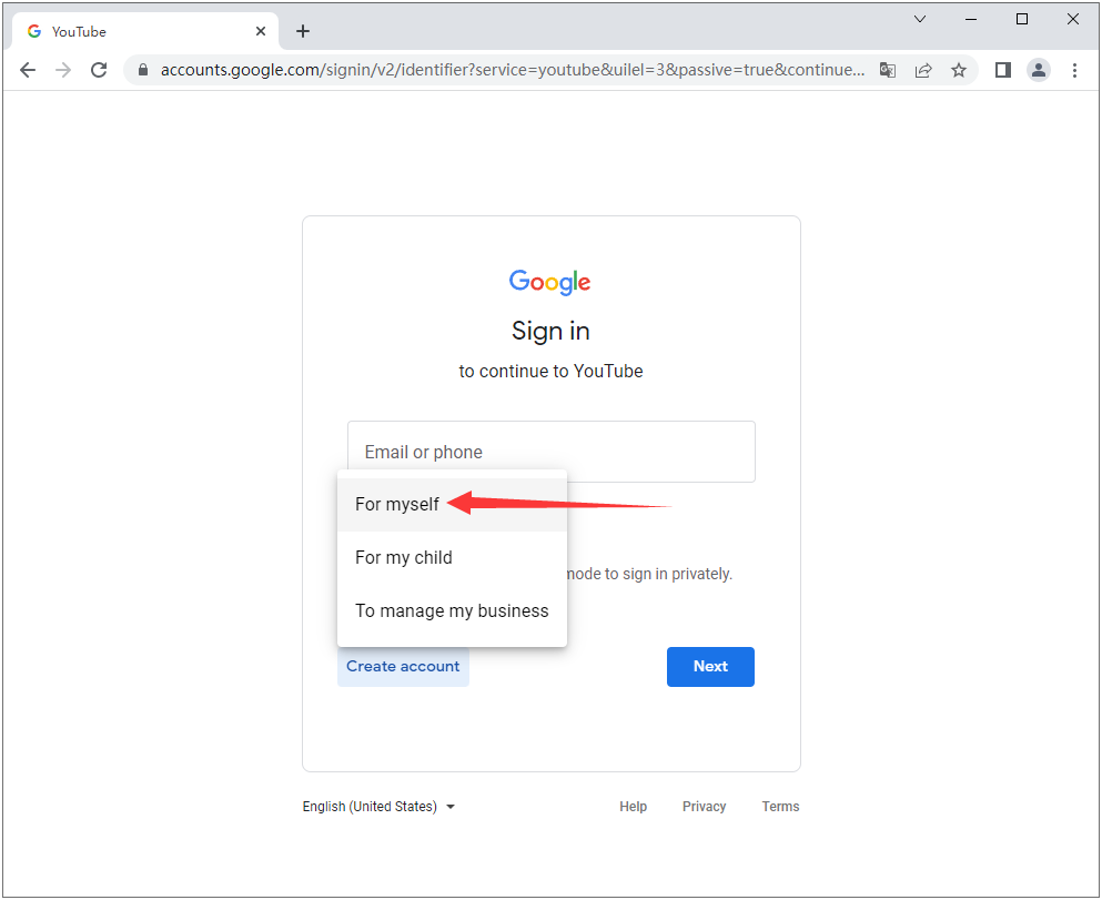 3、接着,“Create account”会弹出选项,此时我们点击第一个“For myself”按钮,该按钮的含义是为我自己注册。