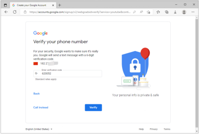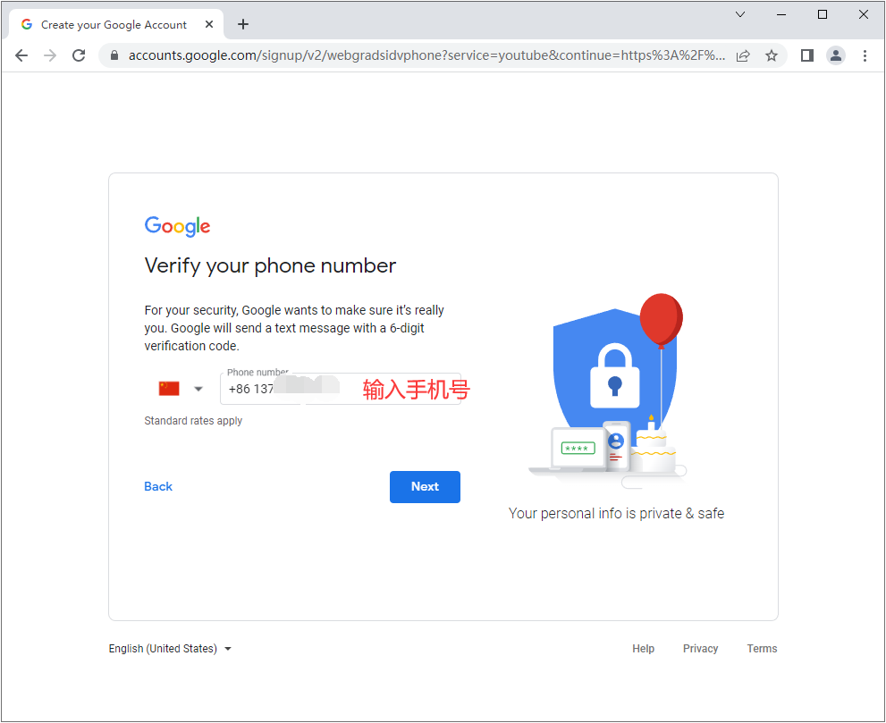 8、输入您所收到的手机验证码,不少人在这一步就难以继续操作,主要原因在于浏览器未使用英文,进而导致无法接收到验证码,还会被谷歌提示“此电话号码不能用于验证。”