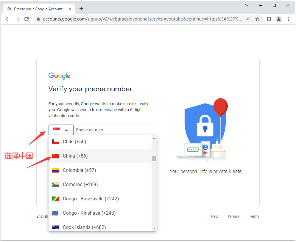 6、在该页面,我们需要选择您所处国家的手机区号,如果在中国境内,您需要选择“+86”的区号。