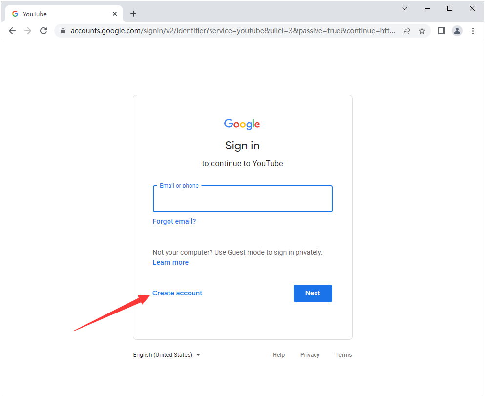2、接着会跳转至谷歌的注册页面(由于谷歌与YouTube同属一家公司的产品),我们点击页面底部的“Create account”按钮。