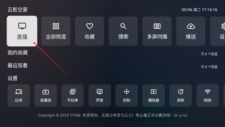 1.打开云影空蒙TV,进入设置中心,在设置界面的右侧,可以看到应用名称和当前版本号,确认版本信息是否正确