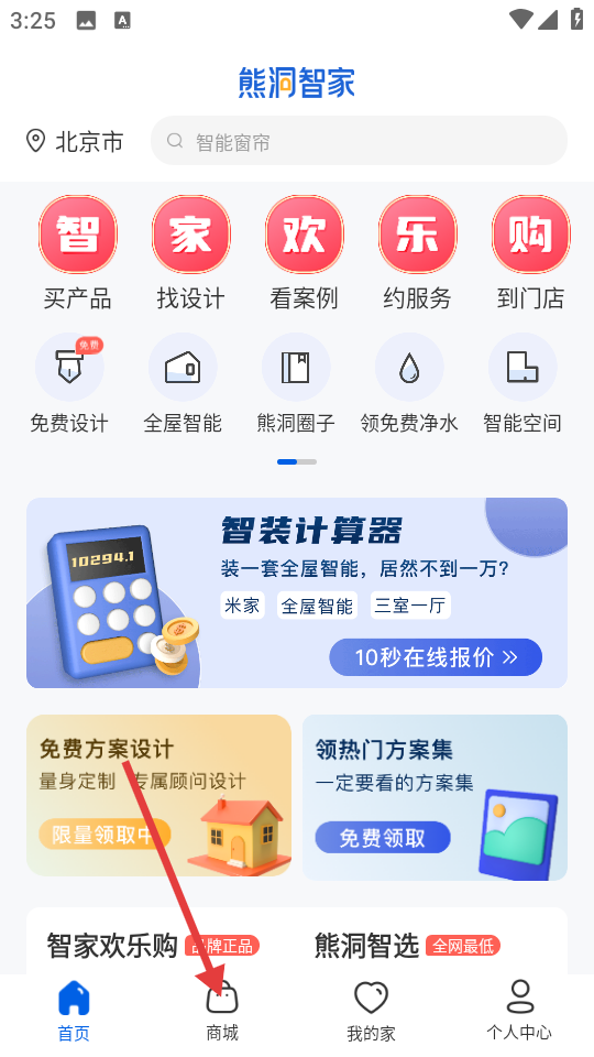 1. 进入【熊洞智家】APP首页,轻点底部导航栏的【商城】按键,从而进入熊洞智家商城界面。