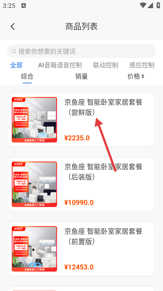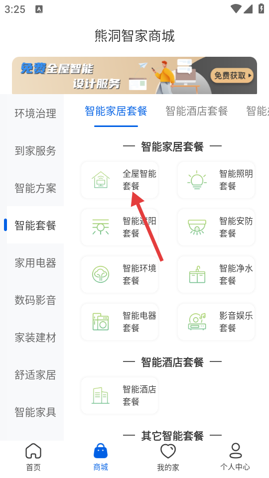 2、在商城页面的【智能家居套餐】分类下,点击【全屋智能套餐】选项,进入商品列表页面。