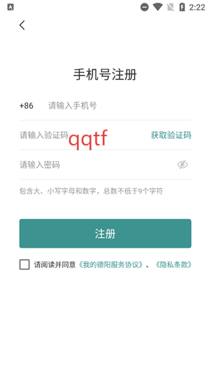 在注册界面输入手机号,验证码和密码等信息,点击完成注册。
