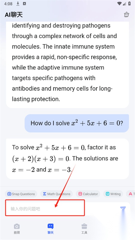 3、在聊天页面,输入你想要了解的问题发送即可