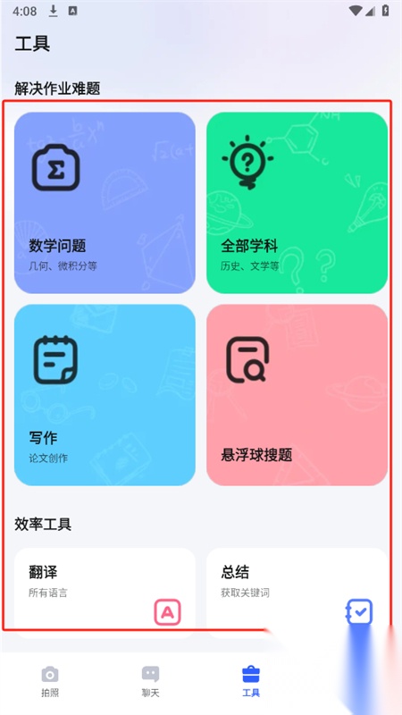 4、在工具页面,这里为大家提供了翻译、写作、悬浮球搜题等工具