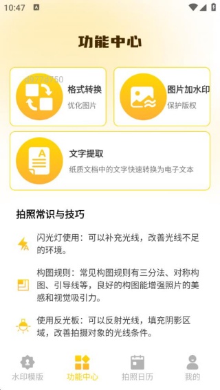 2、点击功能中心,有格式转换,图片加水印,文字提取等功能,都可以方便去进行。
