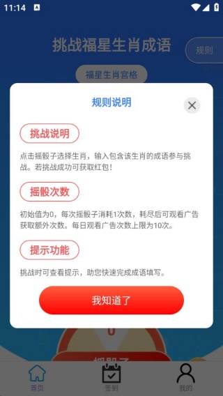 2、通过摇骰子随机选定生肖,然后输入包含该生肖的成语即可参与挑战,挑战成功可获取红包奖励。
