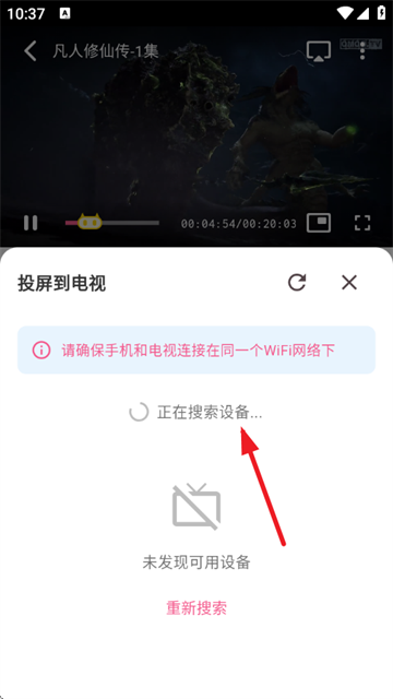 4、若搜索不到,就持续重新搜索,直至找到电视设备,随后点击连接,这样就能投屏到电视上观看了。