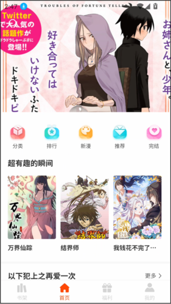 2、处于首页界面时,我们不但能看到各类热门推荐的漫画作品,还能切实体验到分类、排行、新漫、推荐等一系列板块所带来的便捷。