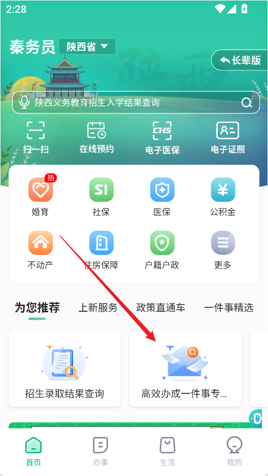 1. 开启秦务员App,来到首页后点击「高效办成一件事专区」,进而挑选「教育入学一件事」。