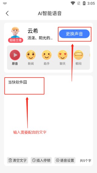 2、在图中所示文本框处,输入需要配音的文字,点击上方“更换声音”选项,就能选择不同的声音。