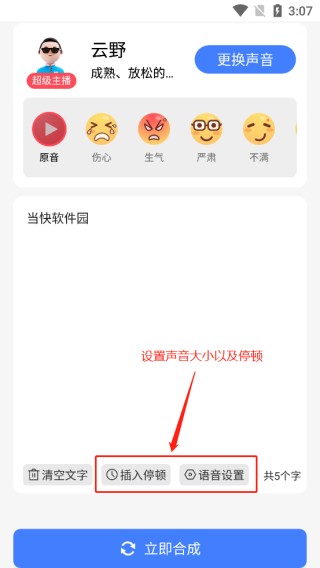 4、通过图示选项,能够对配音声音的大小以及语气停顿进行设置。