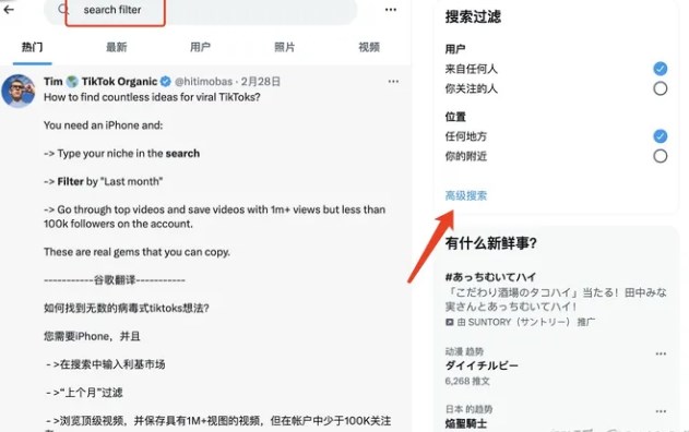 在相应的搜索栏里输入搜索内容。比如,你能够输入特定的推文内容、作者、人物、地点等。