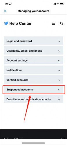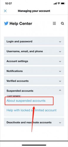 5、点击「关于封禁账号 About suspended accounts」(此内容已最简,若要修改可考虑:5、轻点「关于封禁账号 About suspended accounts」 或 5、选择点击「关于封禁账号 About suspended accounts」 等)