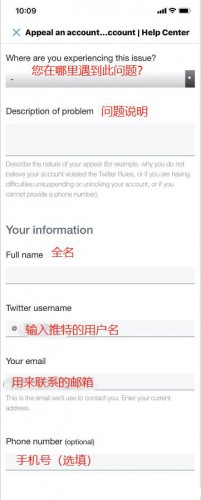请填写您遭遇此问题的具体地点,您的全名、推特用户名,以及用于联系的邮箱。