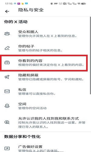 3、于“隐私与安全”页面里,点击“你能看到的内容”选项。