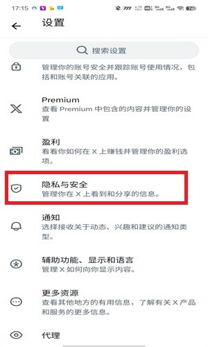 5、于“设置和隐私”页面里,挑选“隐私和安全”选项。