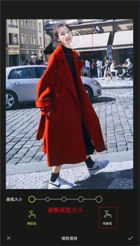 4、轻点瘦脸瘦身功能,拖动脸颊部位就能实现瘦脸,具体操作如以下图示。