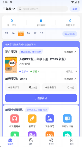 2. 完成之后,进入背单词页面,便能看到诸多学习功能。