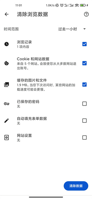 4、选择清理的时间范围,对浏览记录、缓存的图片与文件、cookie以及网站数据等需要清理的信息执行清理操作。