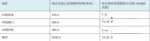 需注意,仅部分门票可选择邮寄服务,且使用该服务需支付相应费用,详情如下图示: