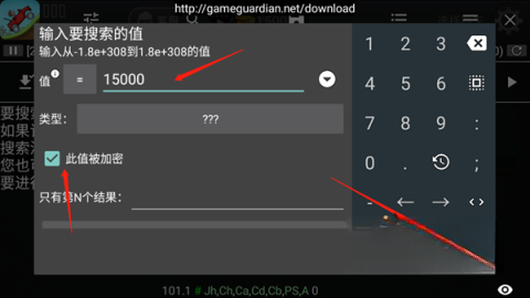 7、填入当前金币数量,并勾选【此值被加密】选项,接着点击【新搜索】按钮。