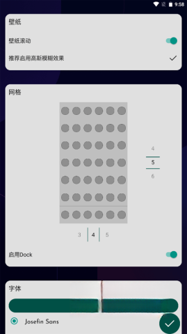 1. 第一步,打开应用程序,在其中设置壁纸滚动效果、迷人的高斯模糊,挑选网格形式、字体等。待各项设置完毕,点击右下角的“√”以确认所选内容。