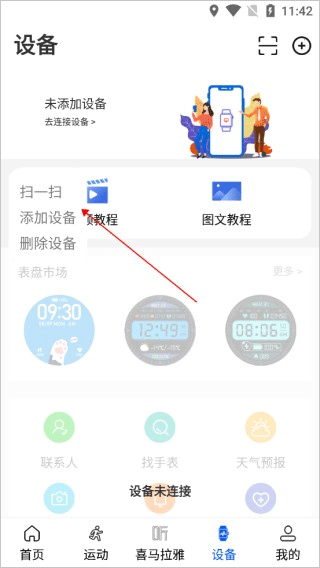 1、在本站完成Wearinos的安装后,运行该软件,点击设备页面,接着点击上方的“为添加设备,去连接设备”。