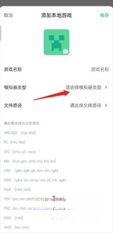 3. 首先输入游戏名称,接着挑选模拟器类型,最后选定文件路径。