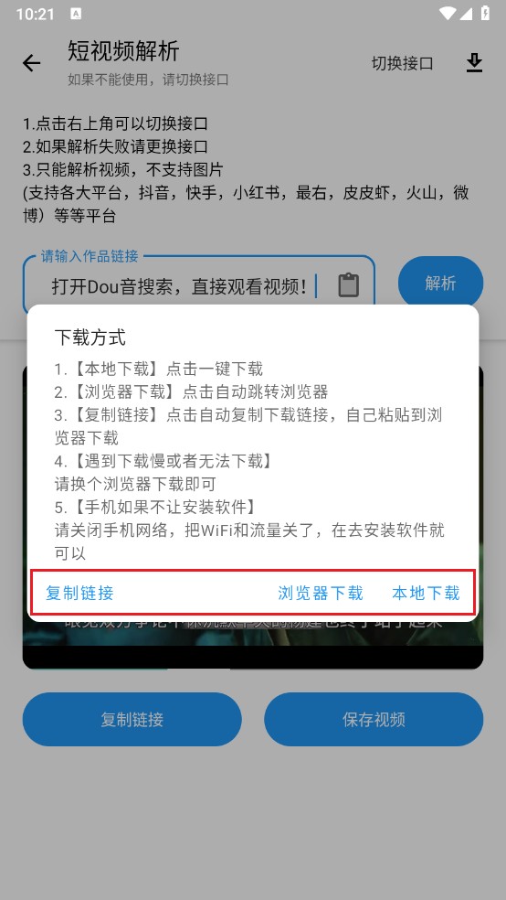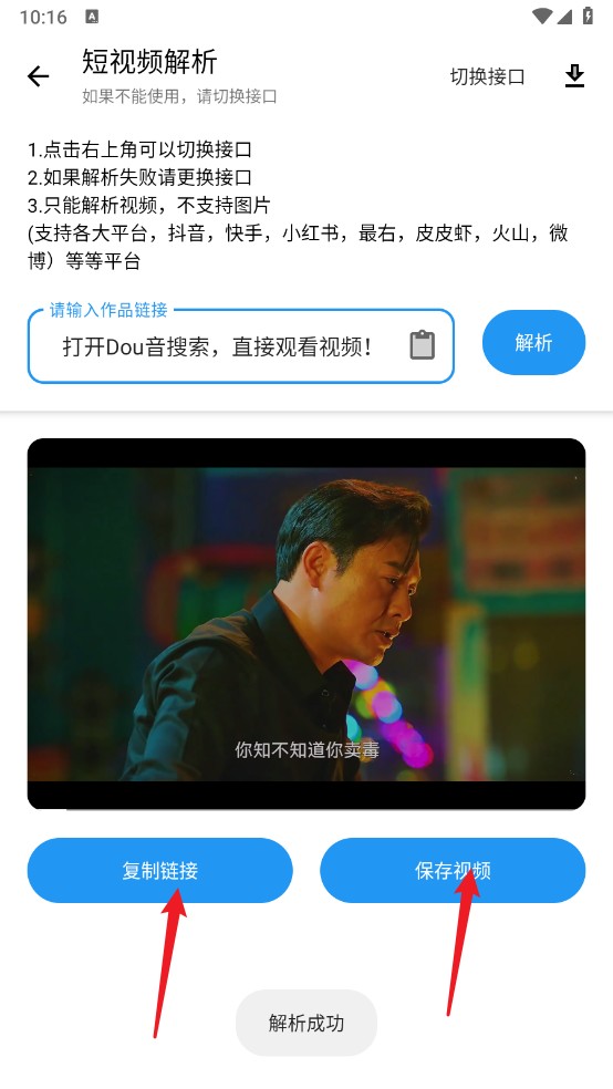 4、解析完成且成功后,提供复制链接或保存视频的功能支持。