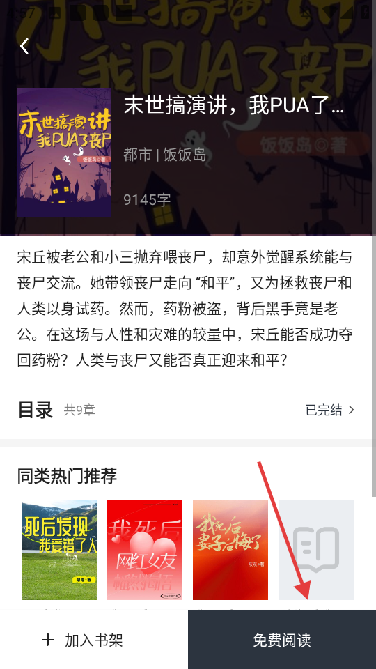 3、当进入书籍详情页面之后,点击【免费阅读】按钮。