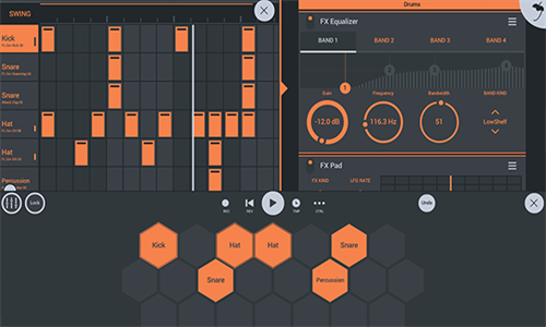2、创新性的可缩放键盘与鼓垫,支持五触点同时演奏,让手机瞬间成为MIDI控制器。