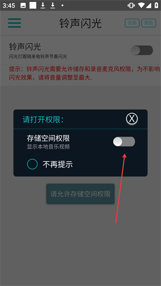 1、在铃声闪光权限请求弹窗里,开启【存储空间权限】,这样就能显示本地音乐视频。