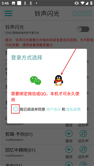 4、点击【登录】,待完成QQ绑定,铃声闪光功能便可永久使用。