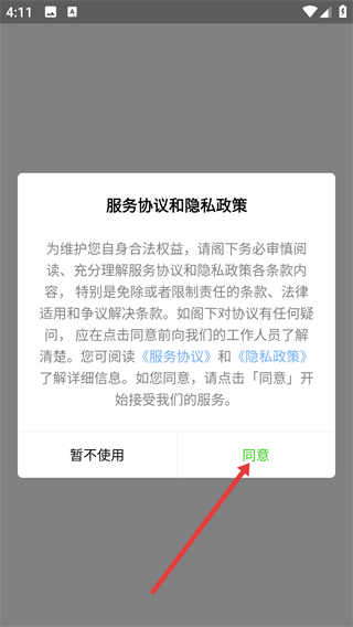 1、于【服务协议和隐私政策】弹窗内,阅读完毕后点击【同意】按钮,方可继续使用软件服务。