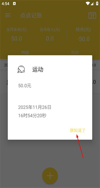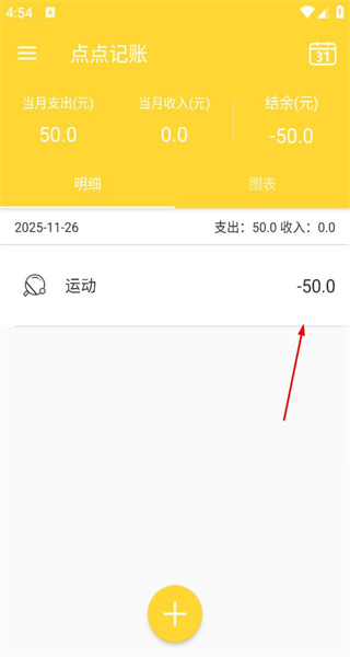 3、完成记账操作后,返回至主页面,此时可见当月支出变为50,结余显示为 -50 ,同时在明细区域出现了与运动相关的支出记录。