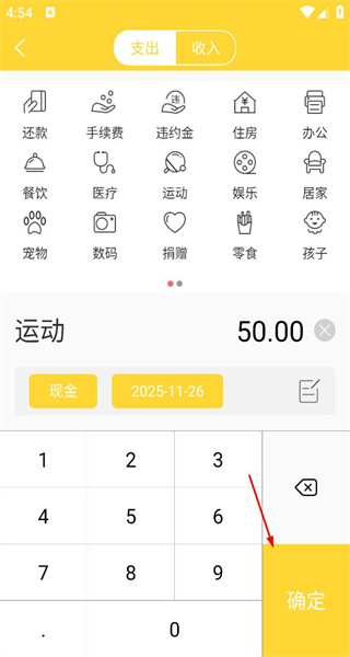 2. 进入记账界面,在支出分类中选择“运动”,输入金额50,选好支付方式和日期,然后点击确定按钮,完成金额填写。
