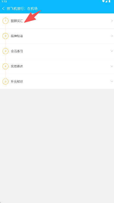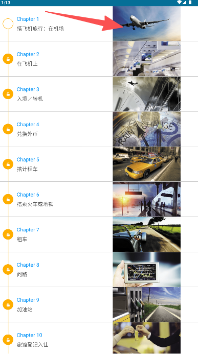 1. 于首页选中Chapter 1“搭飞机旅行:在机场”,随后进入学习页面。