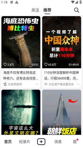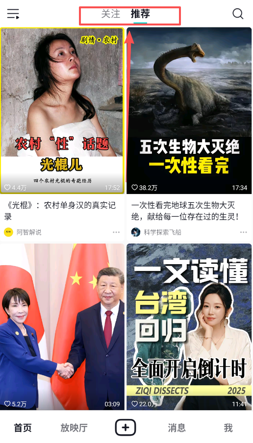 2. 登录之后,进入首页的推荐板块,在此板块中,会呈现各式各样的视频内容,涵盖农村生活记录、科学解说等不同类型。