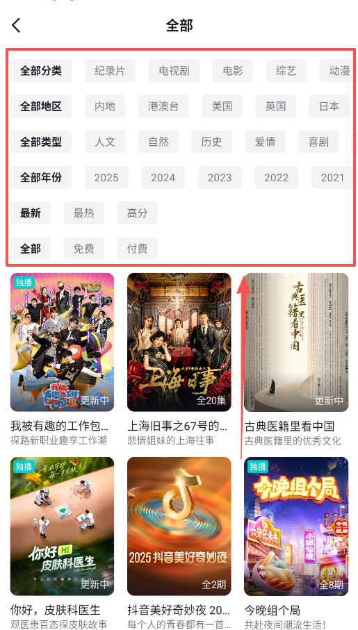 4、借助分类功能,能够精准查找内容。进入全部分类界面后,可依据类型、地区、年份等条件进行筛选。多样化的筛选条件,有助于你迅速找到心仪的内容。