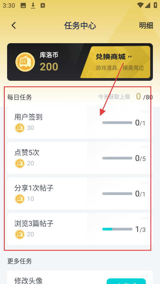 3、于任务中心页面,可查看每日任务,完成任务即可获取库洛币。