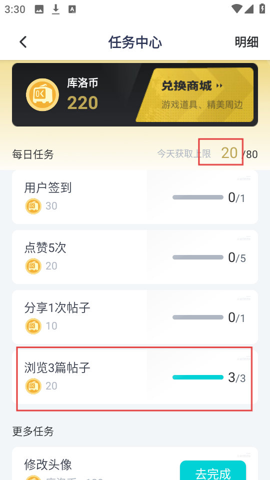 4、当你完成【浏览3篇帖子】这类任务之后,便可以获得相应的库洛币奖励,通过不断积累库洛币,就能够兑换各种好礼哦。