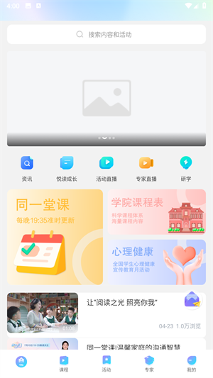 1、启动软件后进入首页,在这里可以查看各类学院的活动信息。