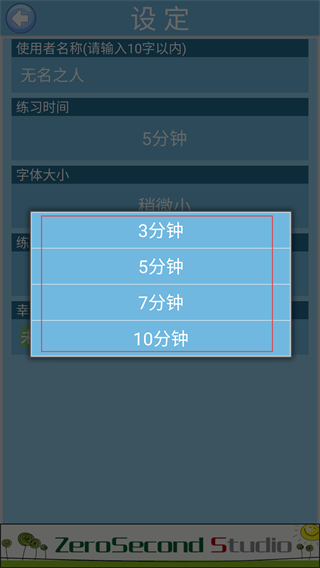 3、点击【练习时间】,随即弹出选项列表,其中有【3分钟】【5分钟】【7分钟】【10分钟】,您可根据自身需求挑选合适的时长。
